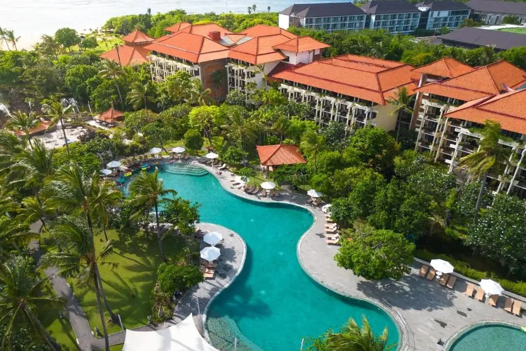 Отель в курортной зоне Нуса Дуа на песчаном пляже. Большая красивая территория, несколько ресторанов с различными кухнями мира. Номера просторные, есть отдельная клубная зона для туристов, предпочитающих спокойный отдых. Архитектура отеля воспроизводит знаменитую древнеиндийскую, эпическую поэму «Рамаяна». Отель больше напоминает величественный балийский дворец на воде с огромными статуями, изображающими героев «Рамаяны», а также живописными лагунами с рыбами, птицами и фонтанами. В ясную погоду с пляжа отеля хорошо видна священная гора Гунунг Агунг. Отель состоит из двух пятиэтажных корпусов: главного корпуса Ayodya Resort и корпуса Ayodya Palace, а также 2 вилл с люксами.