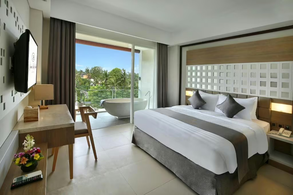 - Legong Keraton Room, 2 номера — 68 кв. м, расположены на 2 и 3 этажах, балкон с видом на бассейн, кровать queen, зона отдыха с креслом, ванная комната с ванной для спа-процедур и отдельной душевой, макс. 2+1 чел.
